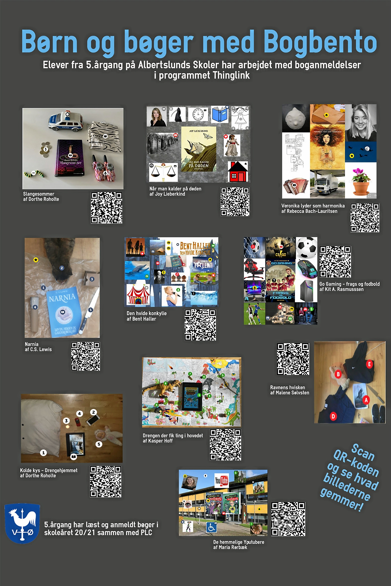 "Vi har samlet nogle af skolernes udvalgte Bogbentoer til en samlet plakat, denne plakat er på vej på skolernes PLC og til 5.årgang. På plakaten kan man gå på opdagelse med QR-koder og se hvad der gemmer sig bag de enkelte fotos. Det kan være et resume af bogen, viden om forfatteren, oplæsning, lydeffekter og andre ting der har med bogen at gøre".