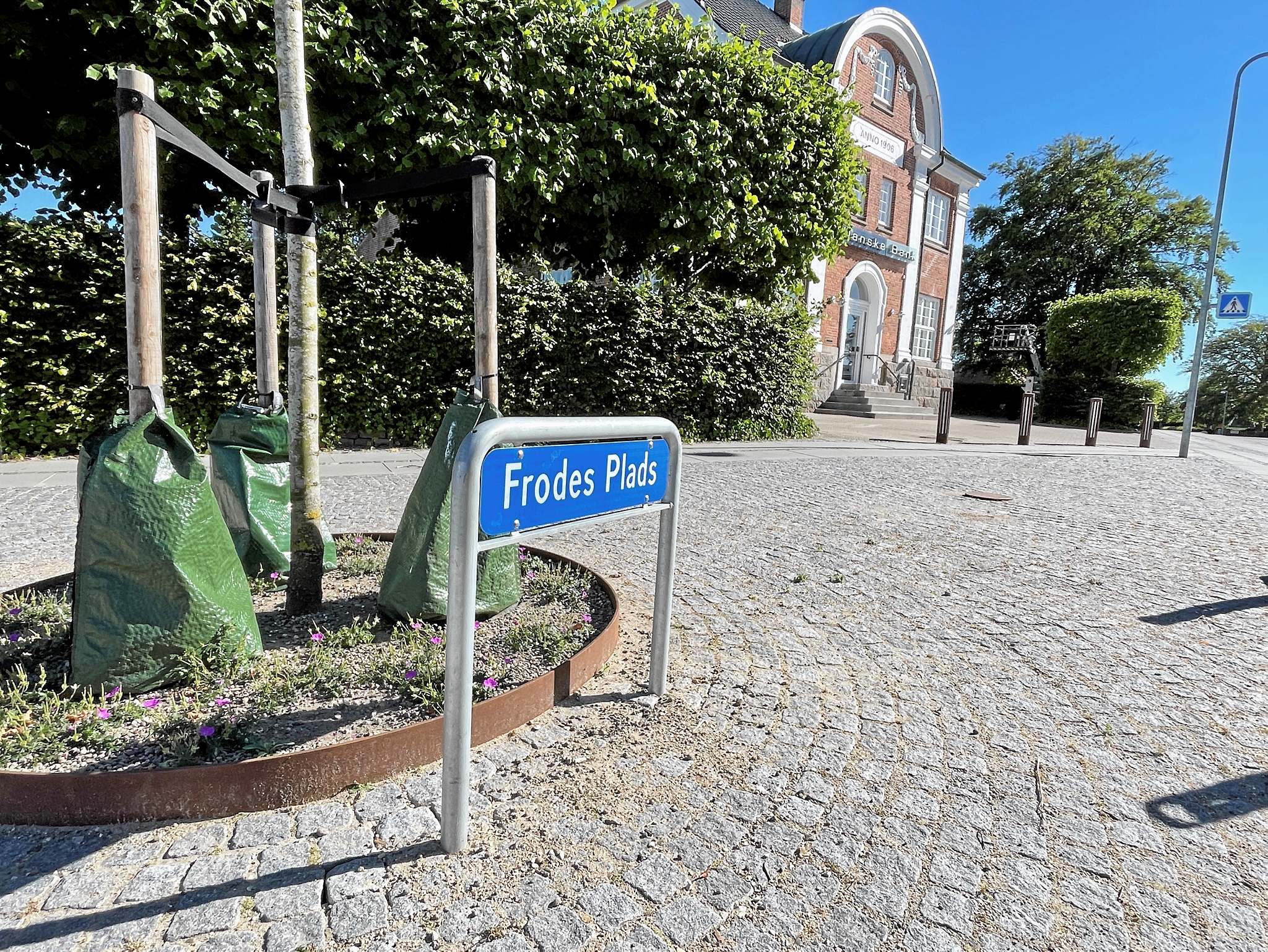 I foråret besluttede udvalget for natur, miljø og grøn omstilling, at søge om tilladelse til, at man kunne give navnet Frodes Plads som stednavn. Den er givet, og nu står skiltet der.