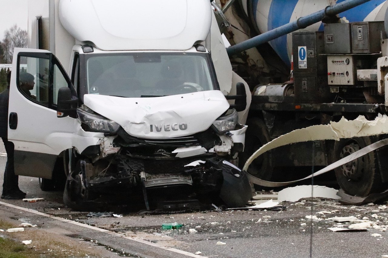 - De er alle tre kommet kørende i retning mod syd. Forrest har vi en lastbil med anhænger. Den bremser, fordi en bil foran den skal svinge ind ad en sidevej. Om varebilen, som er den næste, der kommer, når at standse helt, eller den selv kører op bag i lastbilen med anhængeren, er vi usikre på. Faktum er i hvert tilfælde, at der som nummer tre kommer en cementblander, den rammer varebilen på venstre side i et forsøg på at undvige, siger Charlotte Tornquist fra Midt- og Vestsjællands Politi.