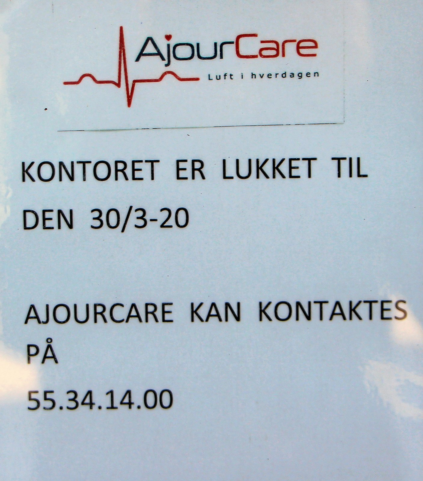 Skiltet til døren ved indgangen til AjourCare i Algade siger, at kontoret er lukket til 30. marts.