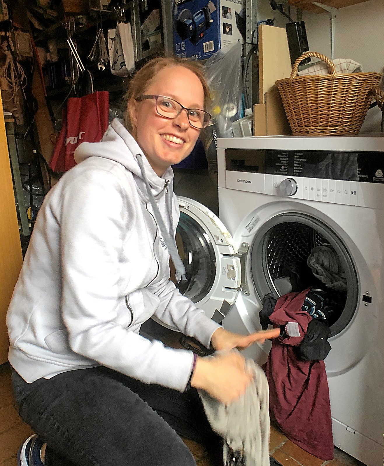Der går tre-fire dage fra vasketøjet afhentes til det leveres tilbage igen og det lufttørres. Enten udenfor eller i stuen, hvis det regner.