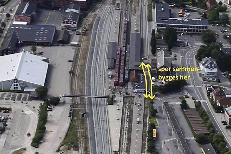 I venstre side af luftfotografiet ses de to gennemgående spor, som allerede findes på Hillerød Station under gangbroen til Carlsbergvej. Hvis man bruger disse eksisterende spor til gennemkørsel for Lokaltog i stedet for at skære stationen over i to dele med nye spor, kan man bevare den direkte adgang fra Stationspladsen til S-togene med de bekvemme skifteforhold. Derved bliver ALLE stationens brugere tilgodeset.