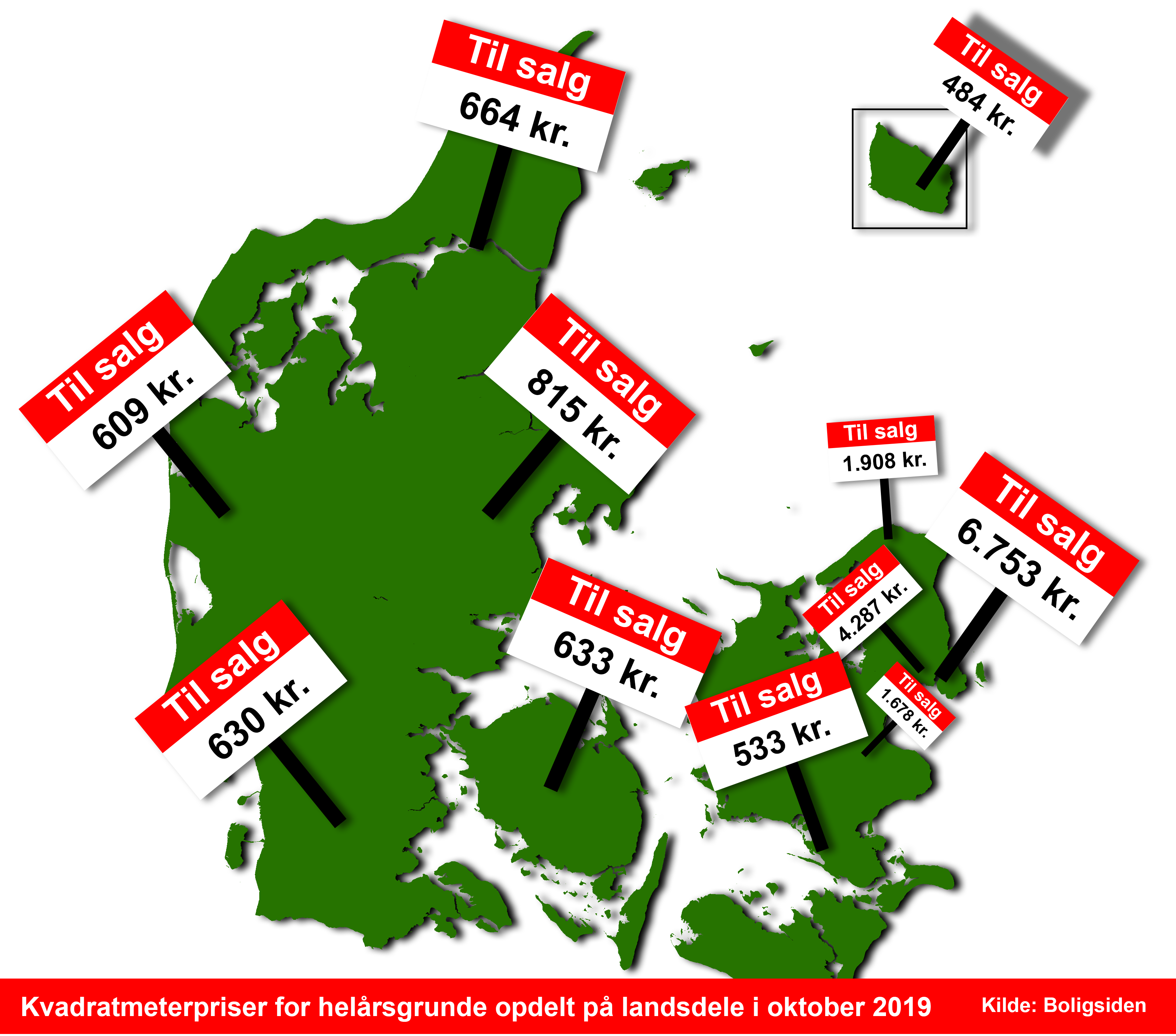 De seneste oktober-tal viser således, at man i gennemsnit skal betale lidt over 3,2 millioner kroner for en helårsgrund i Københavns Omegn. Det er dermed den dyreste landsdel, og omvendt finder vi Bornholm i den anden ende af skalaen, hvor den gennemsnitlige udbudspris aktuelt ligger på under 500.000 kroner.