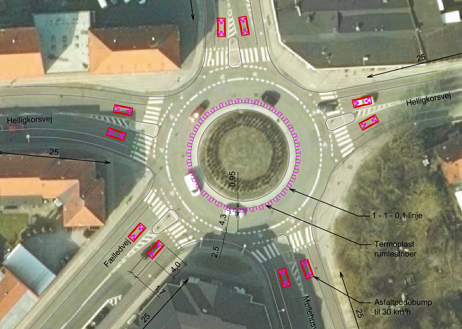 I første omgang etablerer kommunen bump på Fælledvejs og Møllehusvejs nordlige vejgren i efterårsferien. Placeringen af disse to ben vil blive set an i nogle dage for at opnå erfaringer med, om den præcise placering er den rigtige, inden der sættes bump på resten af vejgrenene i uge 43. Der kommer også afmærkning med rumleriller ind mod midterøen, så cirkulationsarealet bliver endnu mindre.