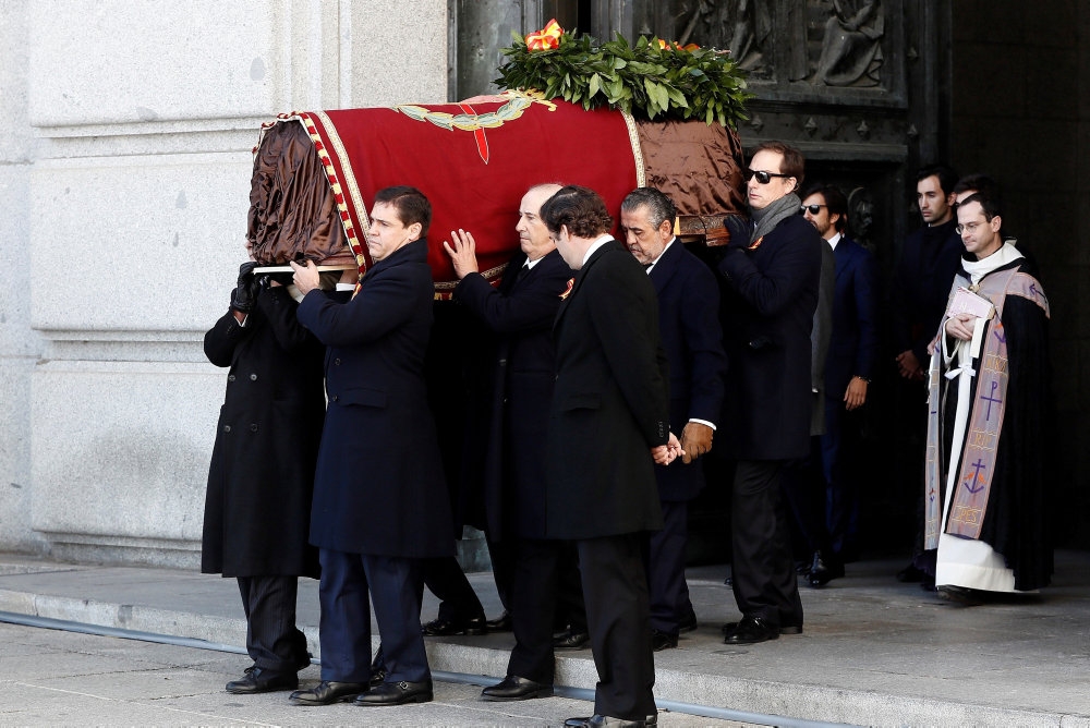 Tv-optagelser fra mindekomplekset De Faldnes Dal viste Francos kiste blive båret væk af otte familiemedlemmer.