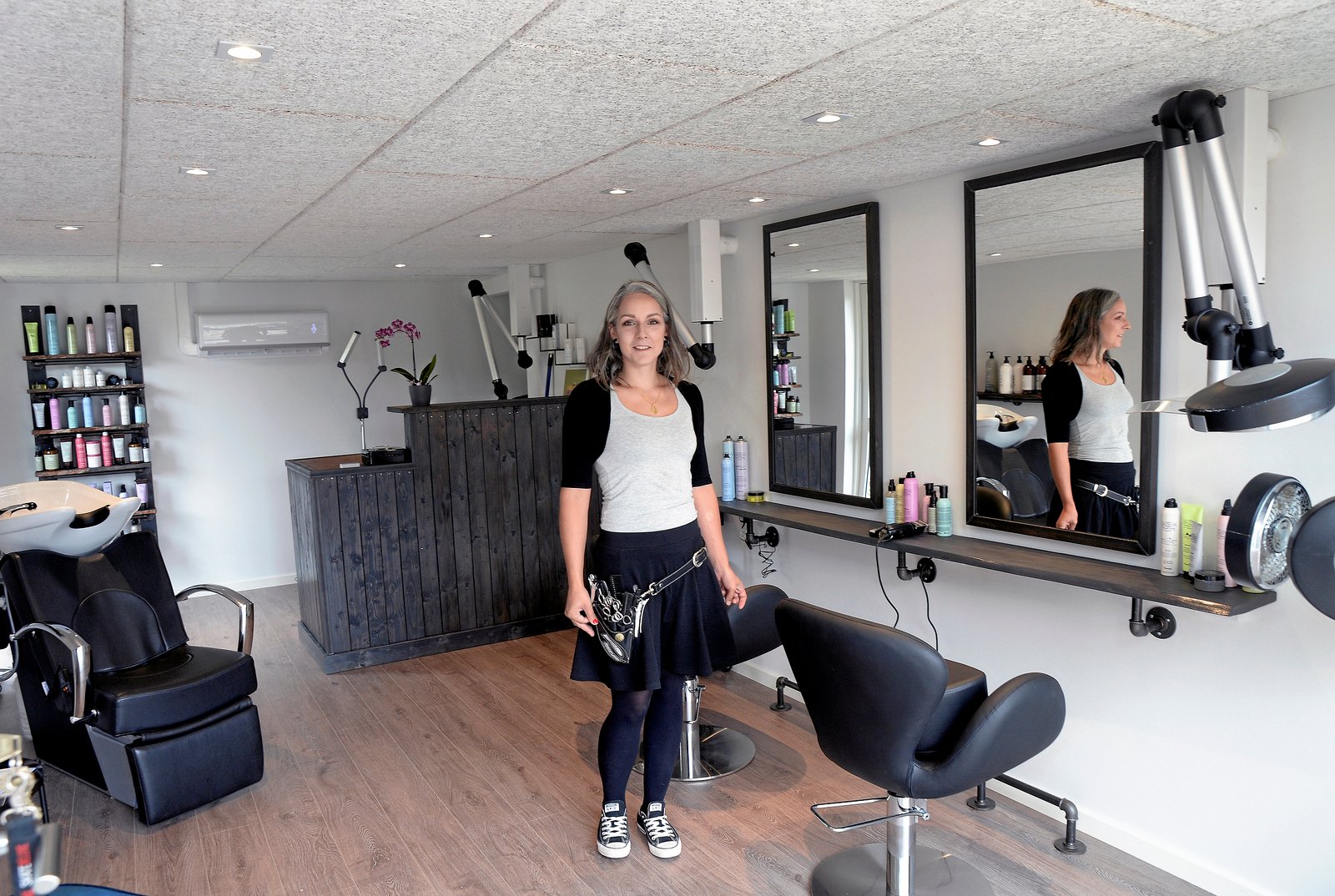 Når den 35-årige frisør nu skal møde på arbejde, skal hun blot gå to meter fra parcelhuset. Den nye salon er nemlig bygget i den ene halvdel af garagen.