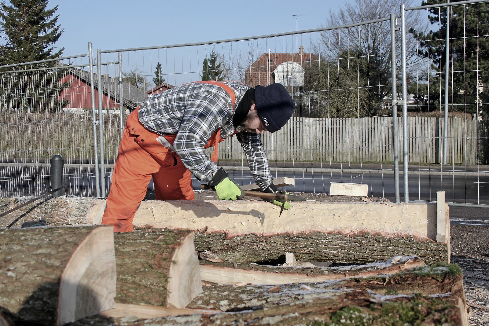 Store træstammer kløves og hugges til et skiltetræ, der skal vise turister vej til seværdigheder fra Hvalsø Station.