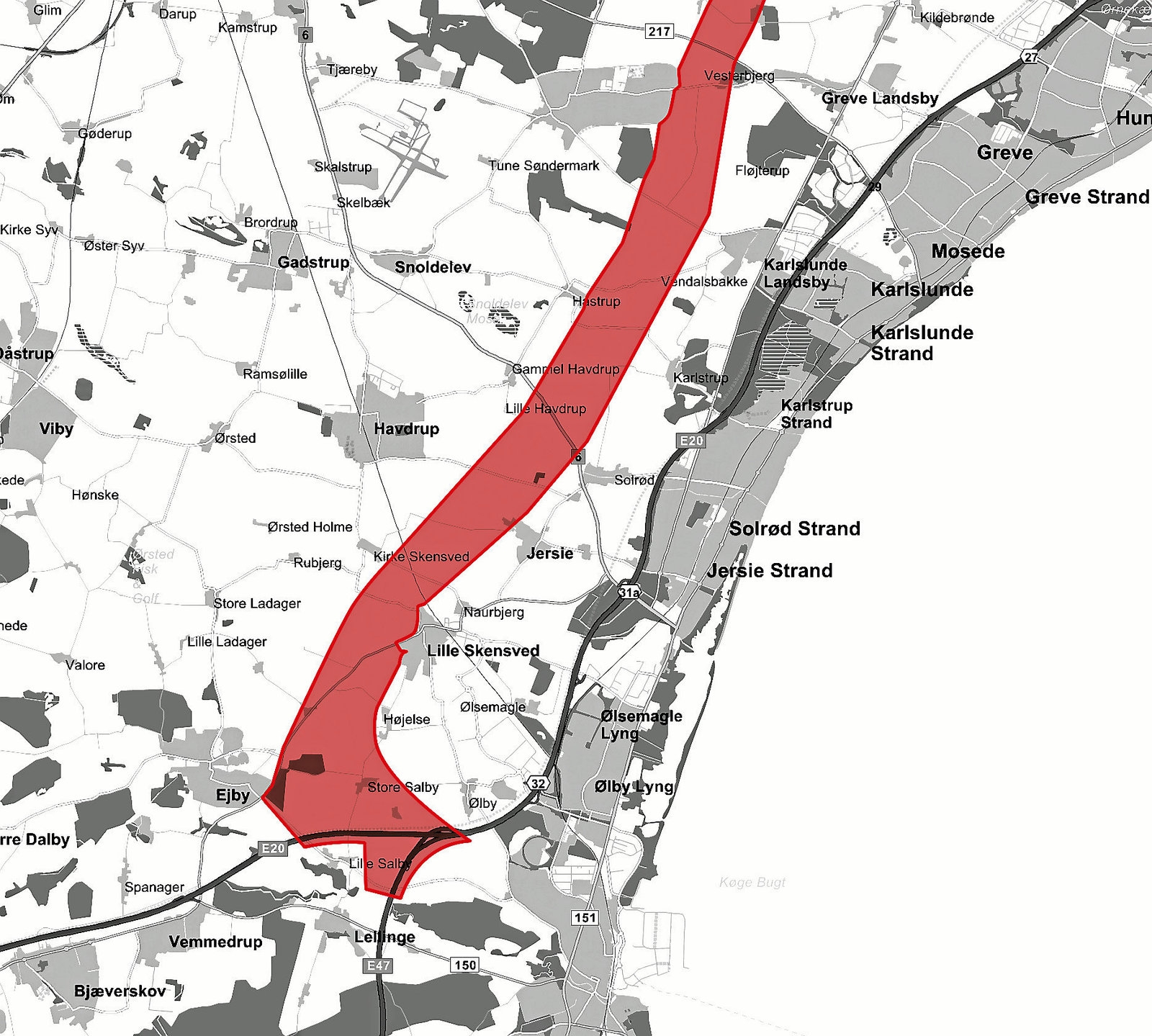 Det fik dengang flere kommuner i området til at opfordre til begrænsninger i bredden af den reserverede korridor, da man mente, at det hæmmer kommunernes muligheder for byudvikling. I Køge Kommune går transportkorridoren fra Lellinge og vest om Højelse og Ll. Skensved, og her mødes projektet med stor skepsis.