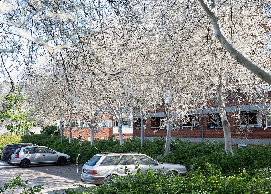 Det er hægspindemøl, der skaber den underlige natur, der nogle steder får området til nærmest at virke ulækker. Der kan være masser af spind på både grene og stammer og meget ofte præger et også fortovene.