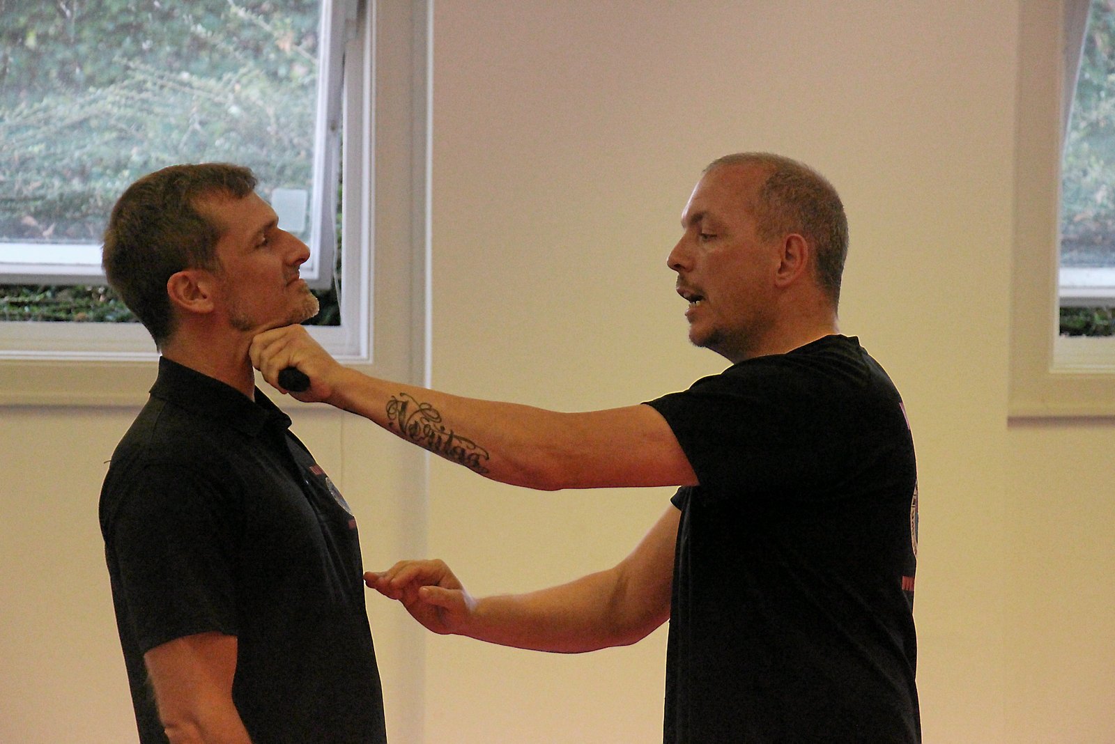 Igen mandag blev der trænet forsvar mod slag, spark og knivoverfald. Inden knivøvelsen viste de to instruktører, Kaspar Bundgaard og Nicholas Bech Castillo, hvordan aftenens deltagere skulle gøre, dog med en lille annotering.