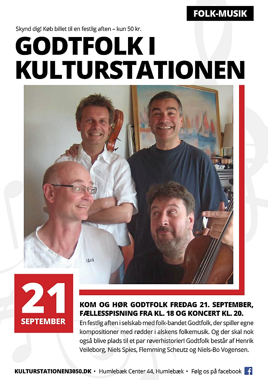 Det sker fredag den 21. september. Dørene åbnes klokken 18.00, hvor der er mulighed for fællesspisning af den medbragte mad. Koncerten starter klokken 20.00, og arrangørerne forventer, at der også bliver tid til et par røverhistorier. Godtfolk består af de fire garvede musikere Henrik Veileborg (guitarer, fløjte, sang), Niels Spies (cister, bouzouki, sang), Flemming Scheutz (fløjter, percussion, sang) og Niels-Bo Vogensen (violin, viola, sang).