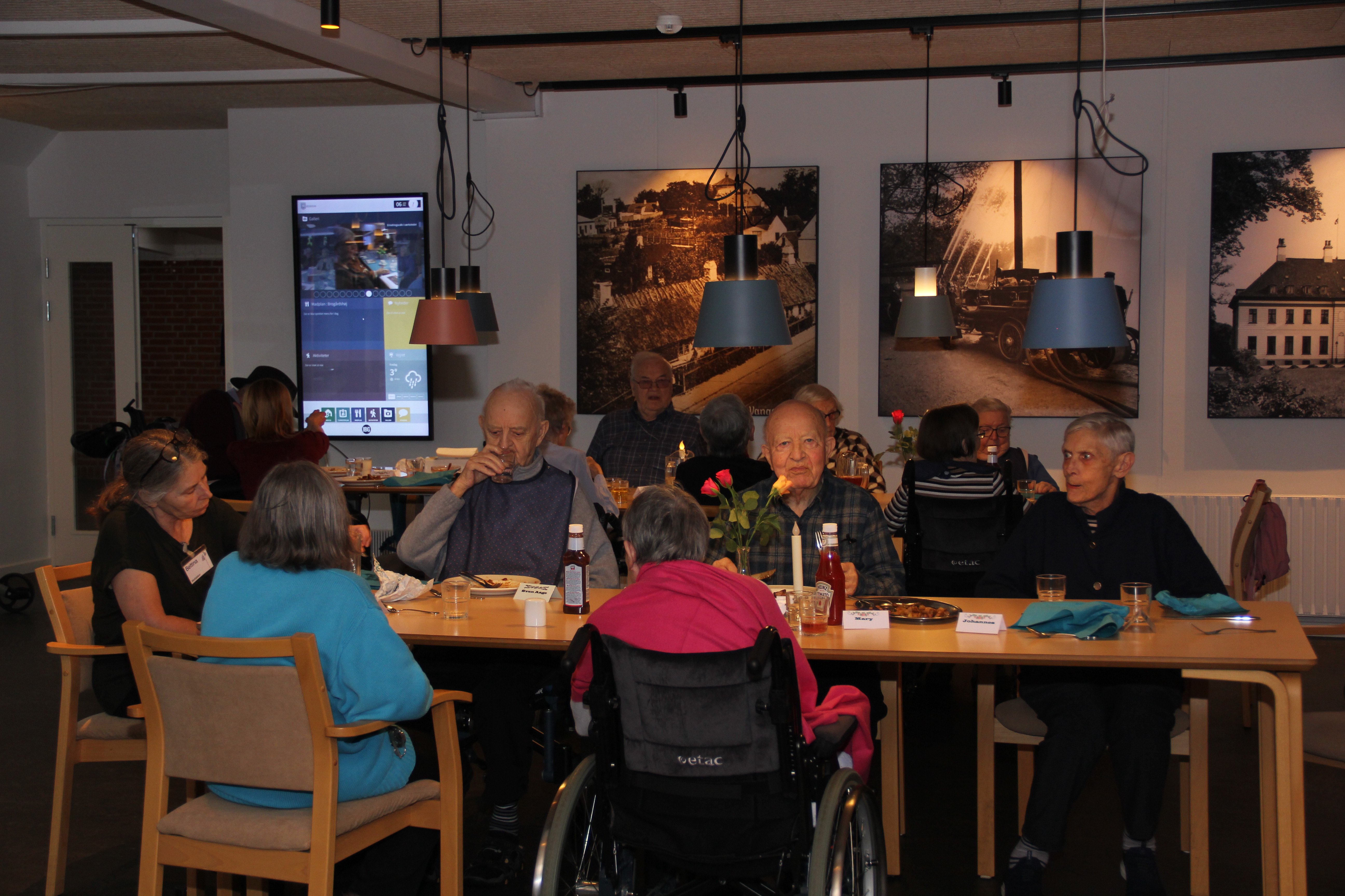 På væggen i spiseområdet hænger der fem store billeder af gamle motiver fra Gentofte. Da de fleste af beboerne har boet i Gentofte det meste af deres liv, giver det anledning til mange gode snakke. Og så har lærrederne også den funktion, at de er med til at give bedre lyd i lokalet.