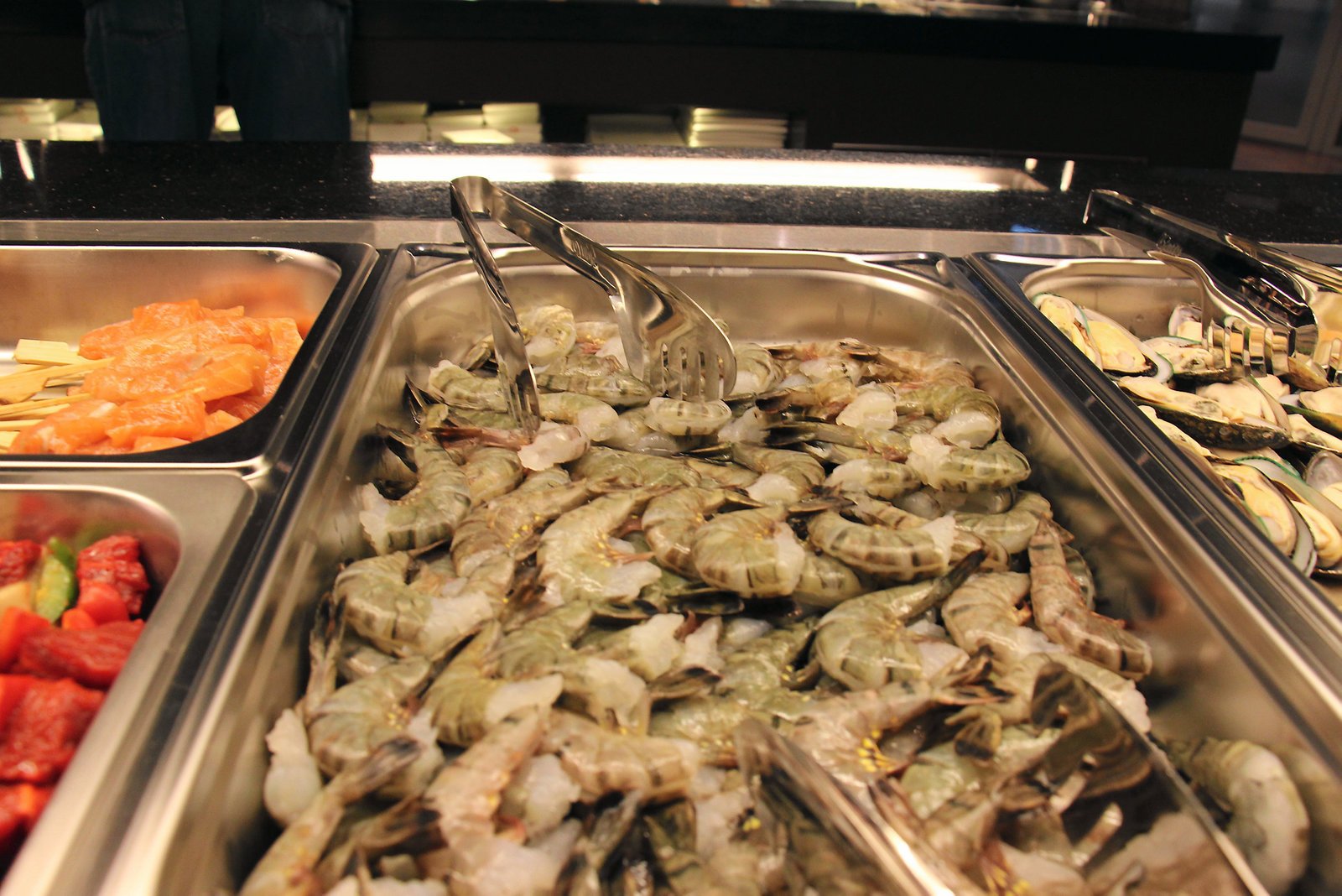 Cirka 50 ruller sushi og buffetens rå rejer og muslinger havde så høje temperaturer, at kontrollanterne forlangte dem kasseret på stedet.