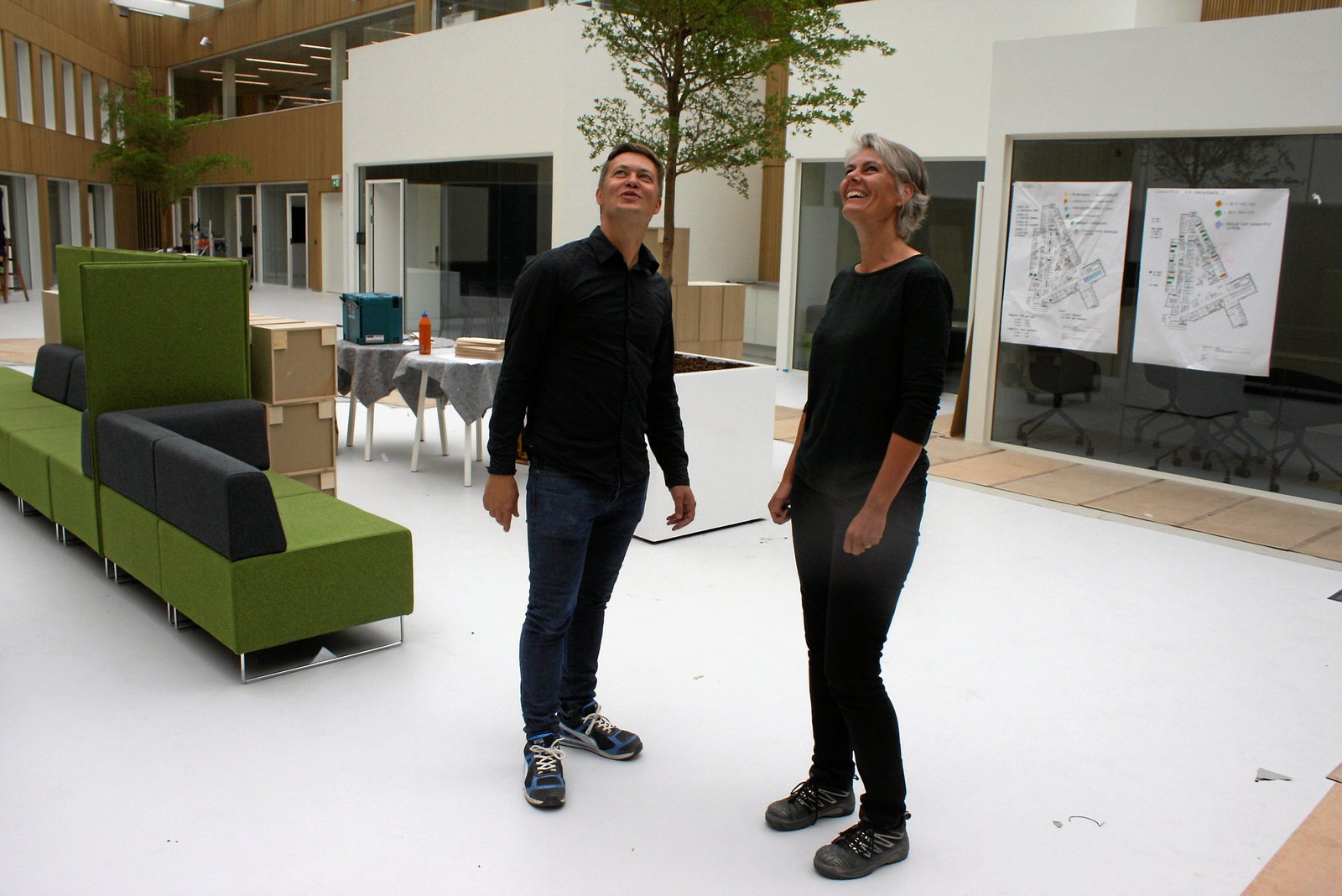 Den nye fløj er bundet sammen med den gamle hovedbygning med atriet i en sløjfe, og selv om der er udpeget områder til de forskellige grene af forvaltningen, er der som udgangspunkt ingen faste arbejdspladser. Der oprettes 330 dockingstationer og så er det ellers som udgangspunkt om at finde en plads hver morgen.