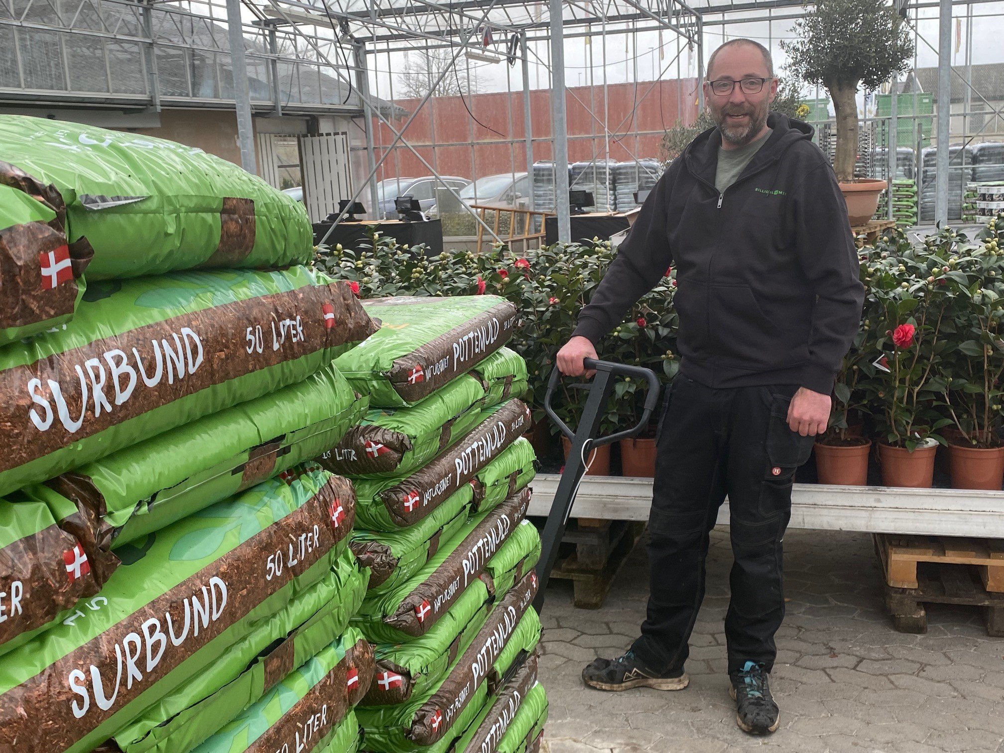 Fredag var omkring 15 medarbejdere i gang med at fylde hylder og reoler op med varer, og blandt dem var butikschef Martin Husted, der flyttede rundt på sække med gødning.
