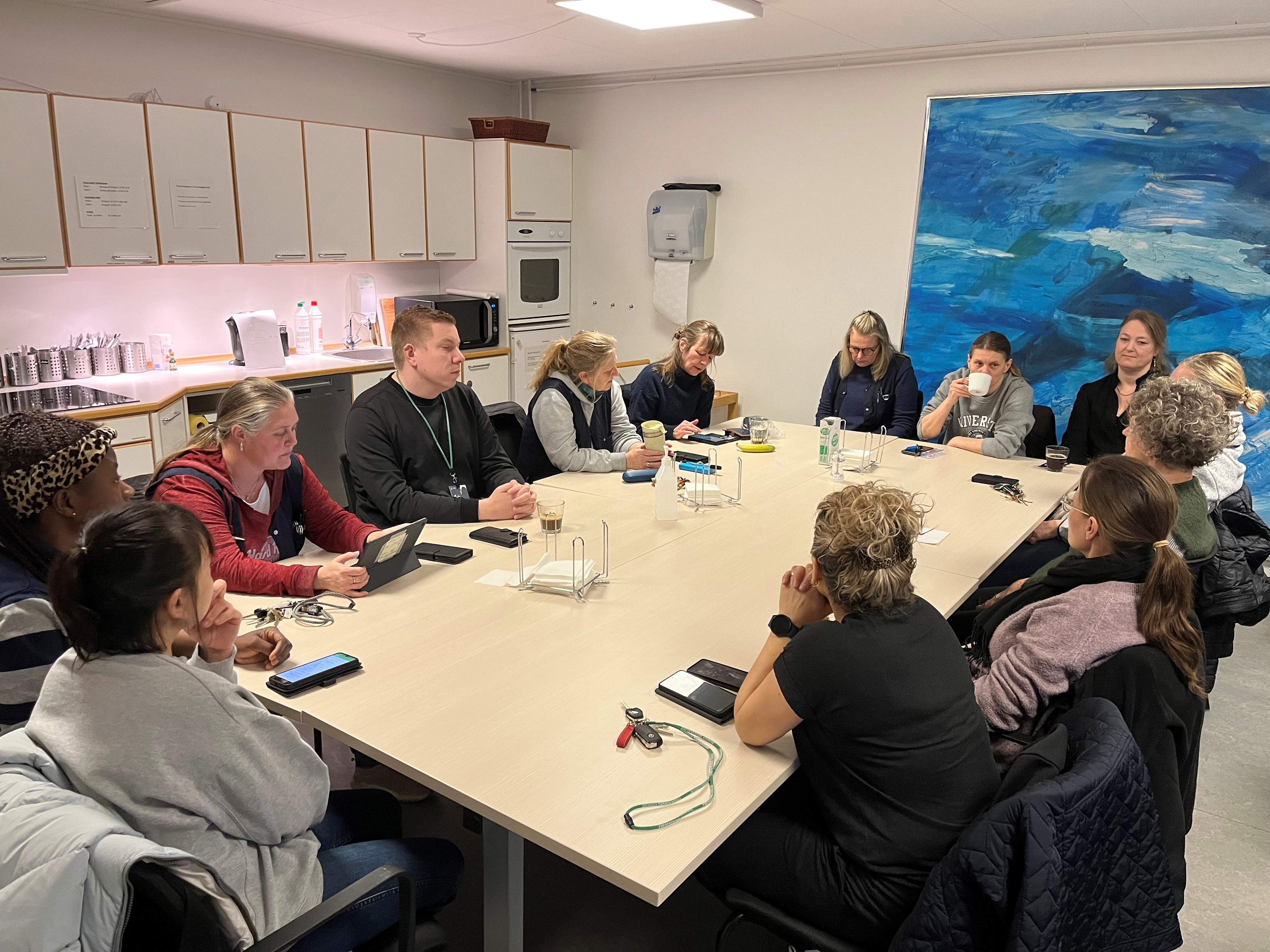 På mødet bliver dagens program vendt blandt teamets medlemmer. Det tæller sosu-hjælpere, sosu-assistenter, sygeplejerske, farmakonomer og ledere, der står for koordinering og planlægning.