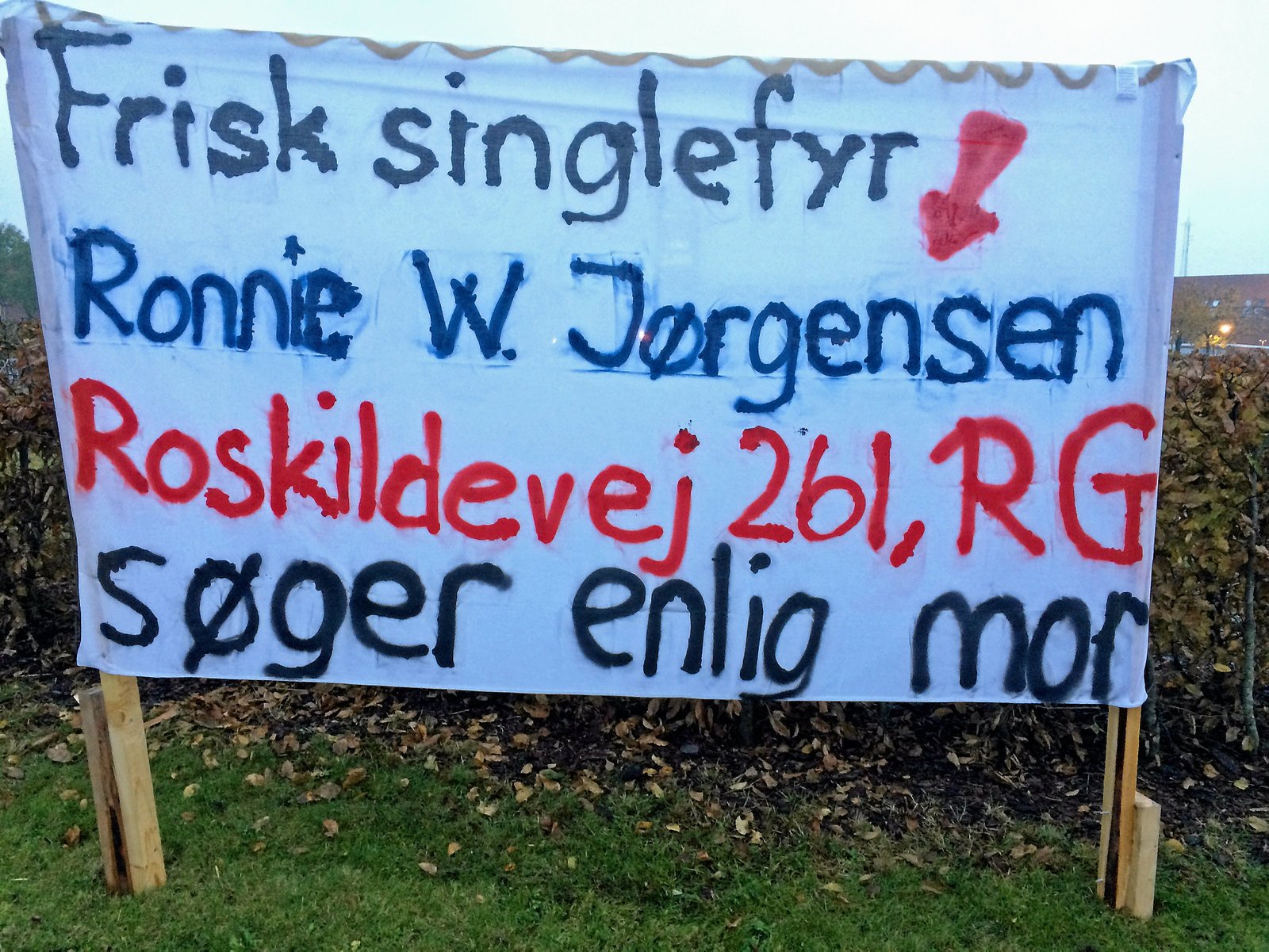 »Frisk singlefyr søger enlig mor.« Og han hedder Ronnie W. Jørgensen og bor på Roskildevej i Benløse.