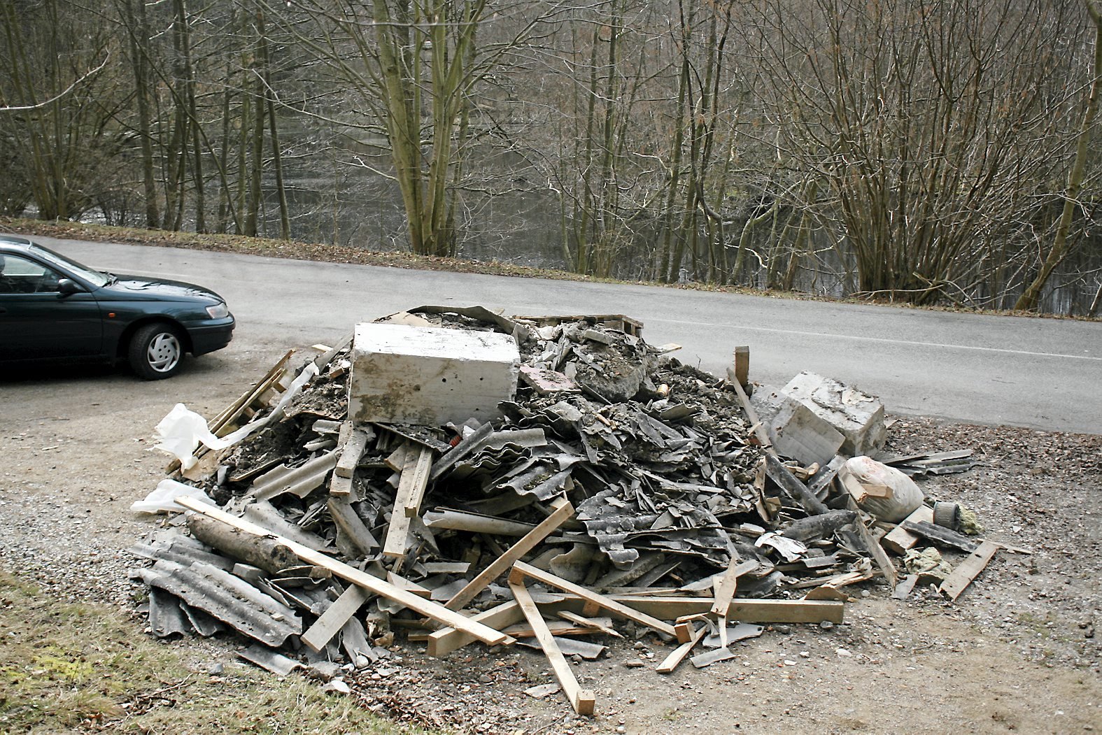 Arresødal: Asbest, træ, paller, isoleringsbats, gammel rockwool i sække tårner sig op lige der, hvor Arresødalvej er spærret, midt i skoven overfor Tranemosen, hvor ænder og andre forårskåde fugle snadrer rundt.