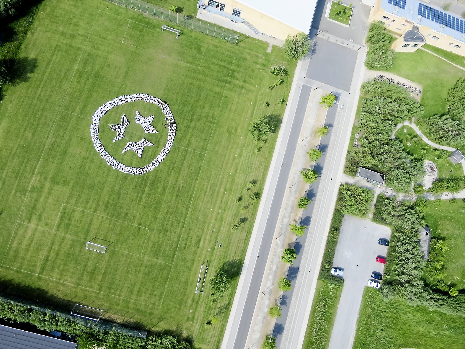 750 elever klædt i hvidt dannede skolens logo på fodboldbanen og skulle ligge stille i syv-otte minutter, mens dronen gennemførte sine overflyvninger.