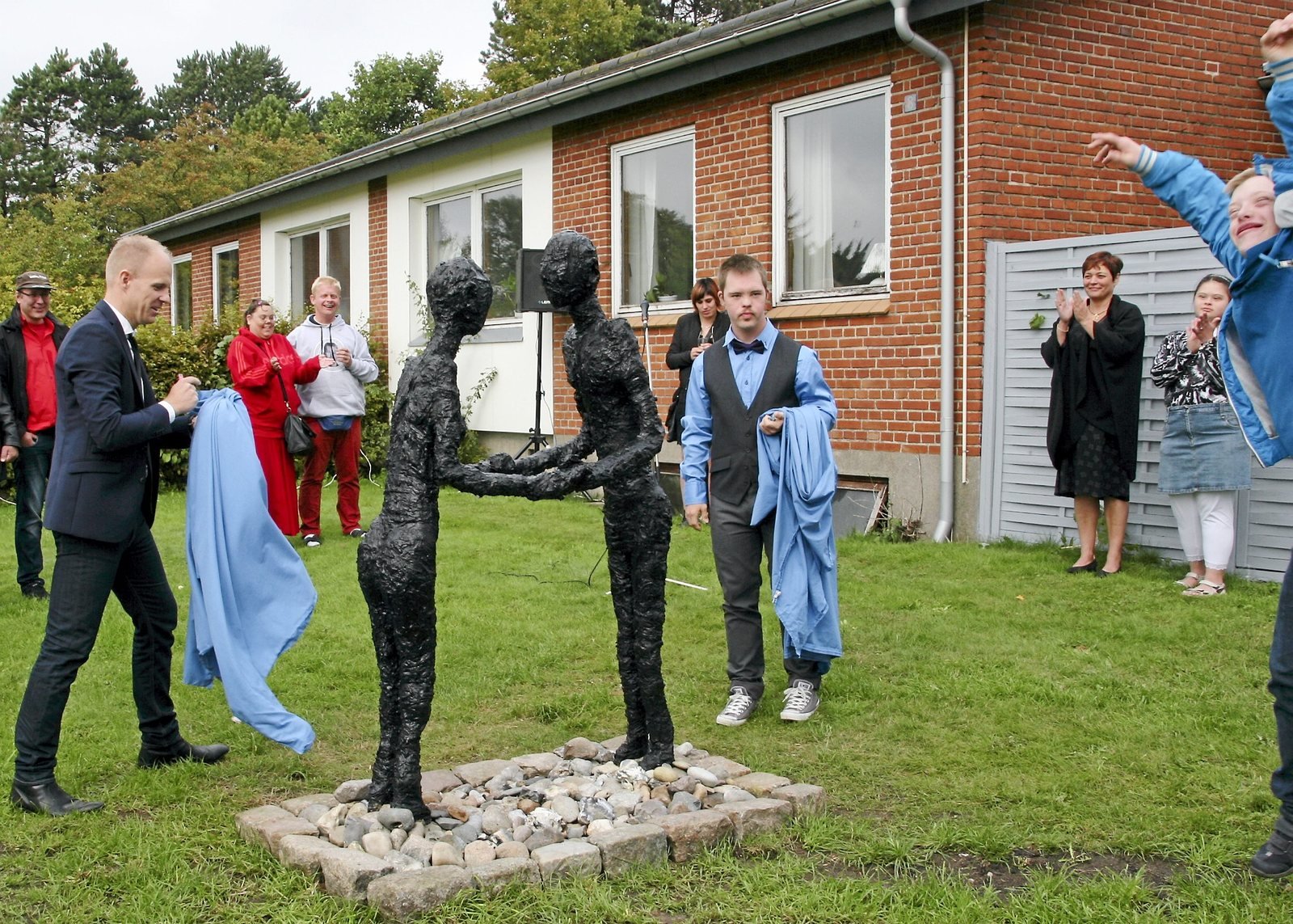 En lille tale eller to og Daniel Lillerøi skal med hjælp fra Lasse, en af skolens elever, afslører vartegnet, og bag det blå klæde dukker et symbol op på det fællesskab, der er skolens grundpille.