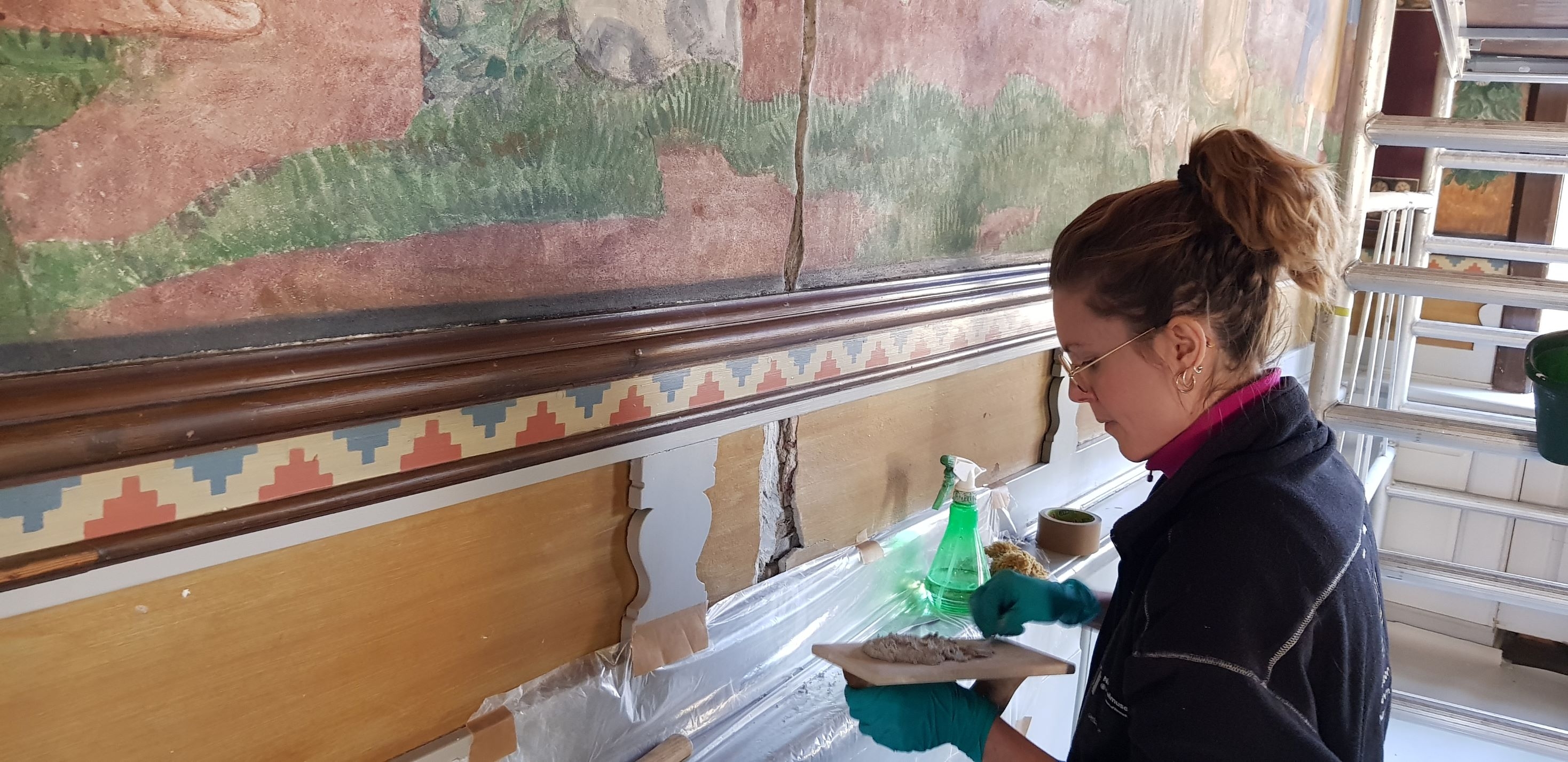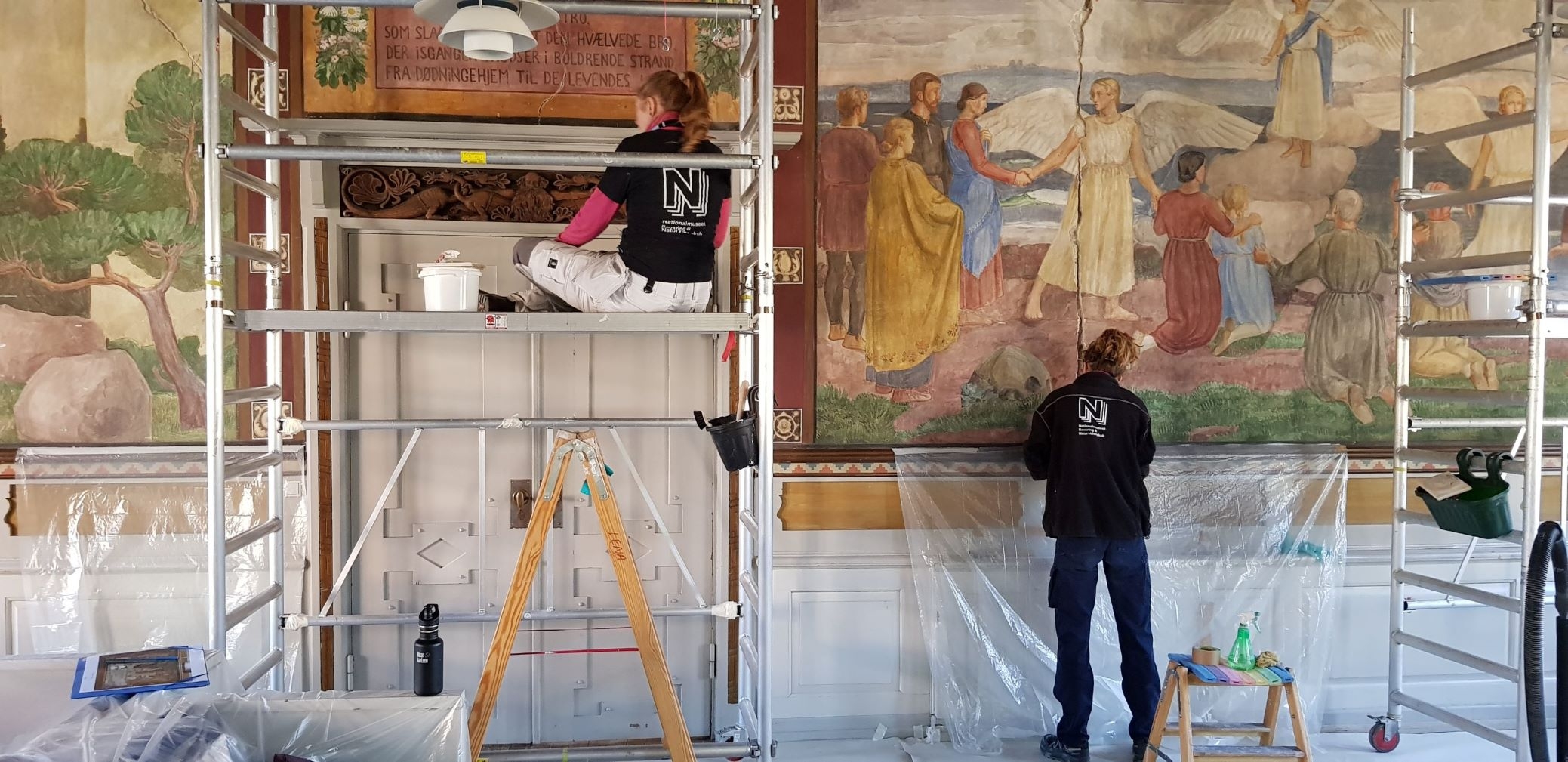 Vallekilde: I Vallekilde Højskoles billedsal er to konservatorer fra Nationalmuseet i gang med at reparere Troels Trier (den ældres) fire store fresko-malerier og rekonstruere og genopfriske farverne.