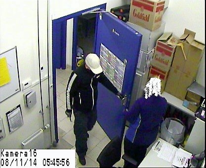 Han var iført en mørk sweatshirt med hvid lynlås, bred hvid stribe ned langs ærmet og et hvidt mærke på venstre bryst. Han bar en hvid kasket, et sort tørklæde for munden, sorte bukser og sorte sko.