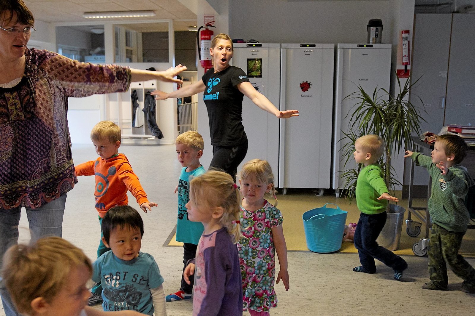 Trampende børnefødder får linoleumsgulvet i fællesrummet i Vejby til at runge. En gruppe af Bakketoppens yngste børnehavebørn er netop landet med udbredte flyvemaskine-arme i »Trampeland,« og gulvet får en solid omgang under grin og fnis.