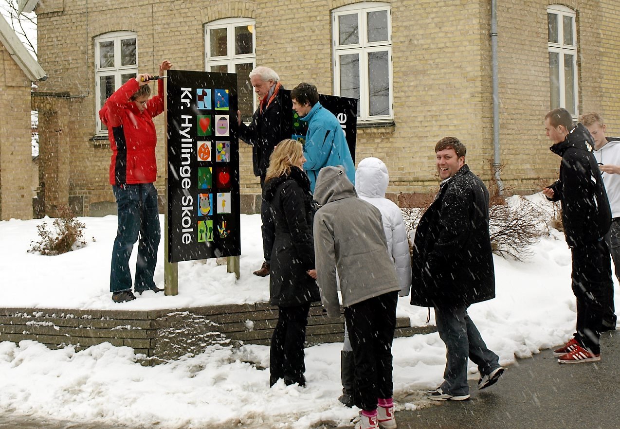 Det er nogle af skolens knapt 500 elever, der har skabt nye skilte, som nu er sat op uden for skolen. Det største kan ses ud imod Bygaden i Kirke Hyllinge.