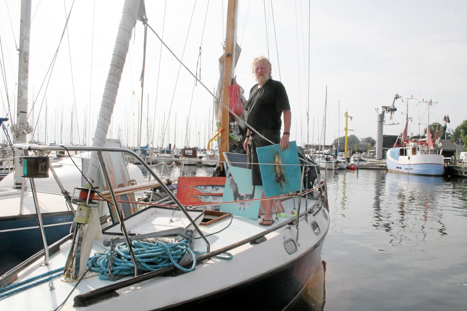 Vedbæk: Der står malerier af måger og hornfisk på dækket, og i kahytten er der kaffe på kanden. Kunstneren og musikeren Morten Huba tilbringer sommeren i sin sejlbåd i Vedbæk Havn, hvor han bader med sin familie og deler sin kunst med havnens gæster.