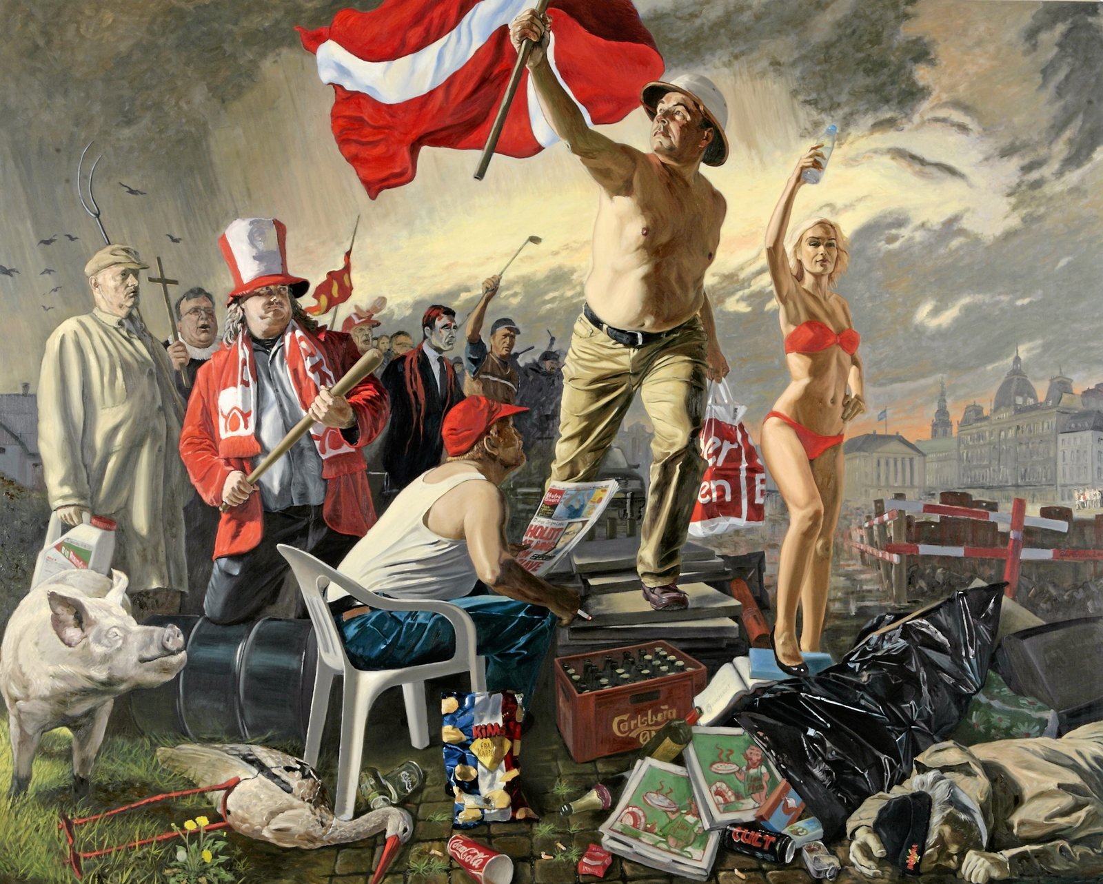 Danmark 2009 er udført som et klassisk heroisk historiemaleri, som en parafrase over den franske maler Eugène Delacroix' berømte maleri fra 1830 "Friheden fører folket på barrikaderne".
