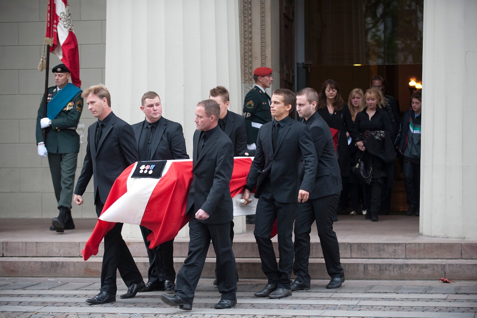 Den 23-årige danske soldat, sergent Michael Ebert fra Birkerød, som blev dræbt 23. oktober i Afghanistan, blev onsdag begravet. Her bæres han kiste ud af Vor Frue Kirke i København.