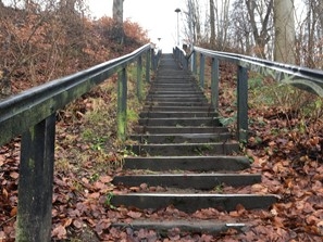 Det sted jeg nok har brugt mest træningstid på gennem årene. Der er 93 trin på vej op ad de tre fag som trappen er delt ind i. Træning på trapper kan enten foregå ved gang, løb eller hop. Det er en effektiv form for kredsløbstræning for både motionister og eliteatleter. Trappetræning og dens effekter tæller både et styrke-, konditions-, stræk- og motorisk element. Den eneste ulempe er, at trappen kan være glat og der er forskel på trinenes højde. Men jeg lover dig, her kan du få pulsen op.