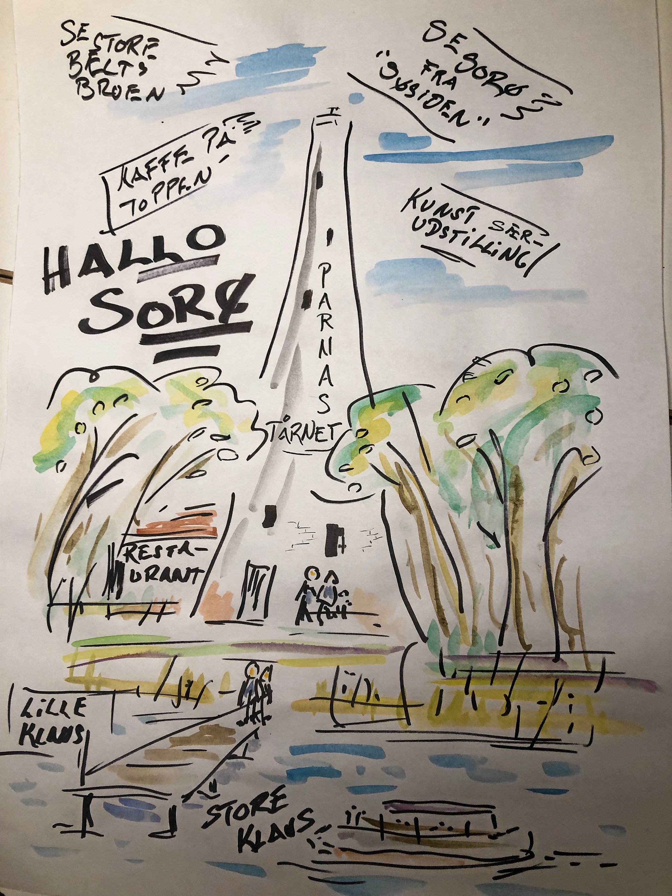 Et højt flot tårn, som et fyrtårn, måske opført i smukke mursten med særudstillinger fra kunstmuseet i et lokale i grundplan. Og med kaffe kage på toppen, med udsigt til Storebæltsbroen og Sorø set fra søsiden med akademiet, klosterkirken og sejlads med Lille Claus (og måske en Store Claus) ind mod byen til en smuk vandretur.