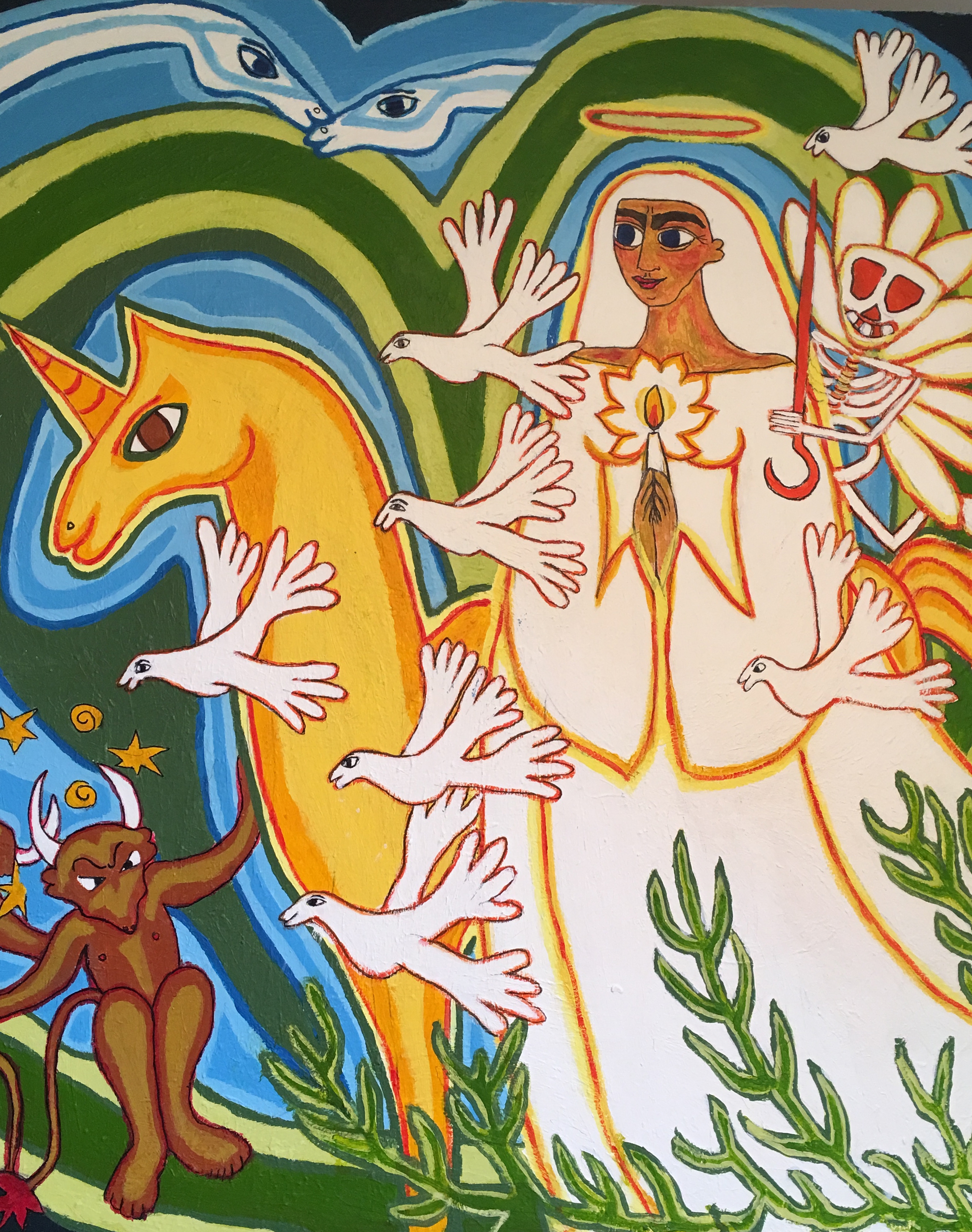 “Dorte Mahlers malerier er farverige, symbolske og fortællende i deres udtryk - kunstneren har blandt andet udstillet i kirkers kirkerum og andre steder, hvor folket færdes,” skriver Stranden i en pressemeddelelse.