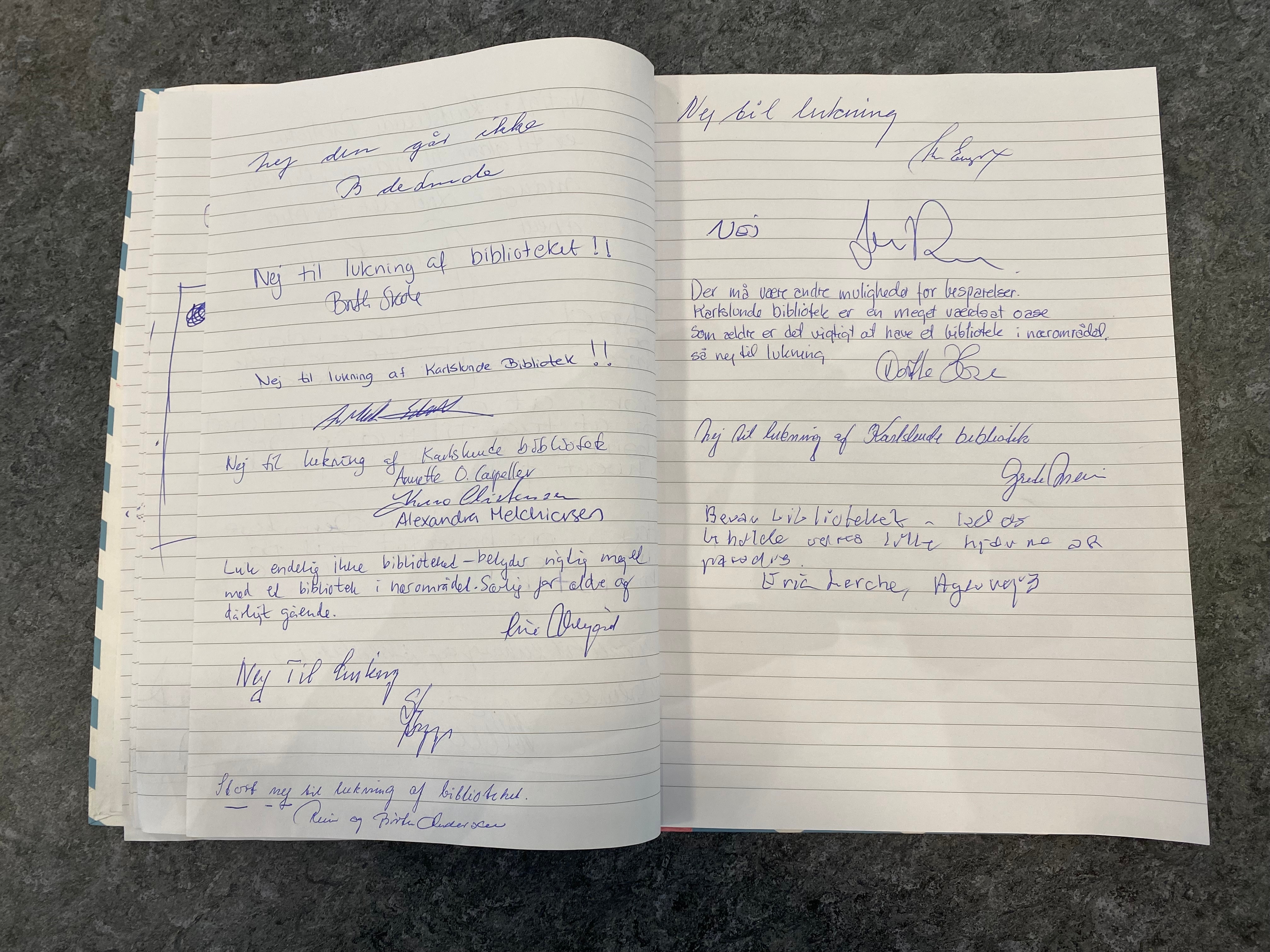 Flere steder hænger der sedler, hvor man opfordres til at protestere mod lukningen af Karlslunde Bibliotek, ligesom over 30 har skrevet i gæstebogen, at de vil bevare biblioteket. ’Biblioteket betyder ALT for os,’ ’Biblioteket er til gavn for virkelig mange,’ Tror I, at alle har mulighed for at tage til Hundige. Børn, ældre og sårbare gør det i hvert fald ikke,’ står der blandt andet.