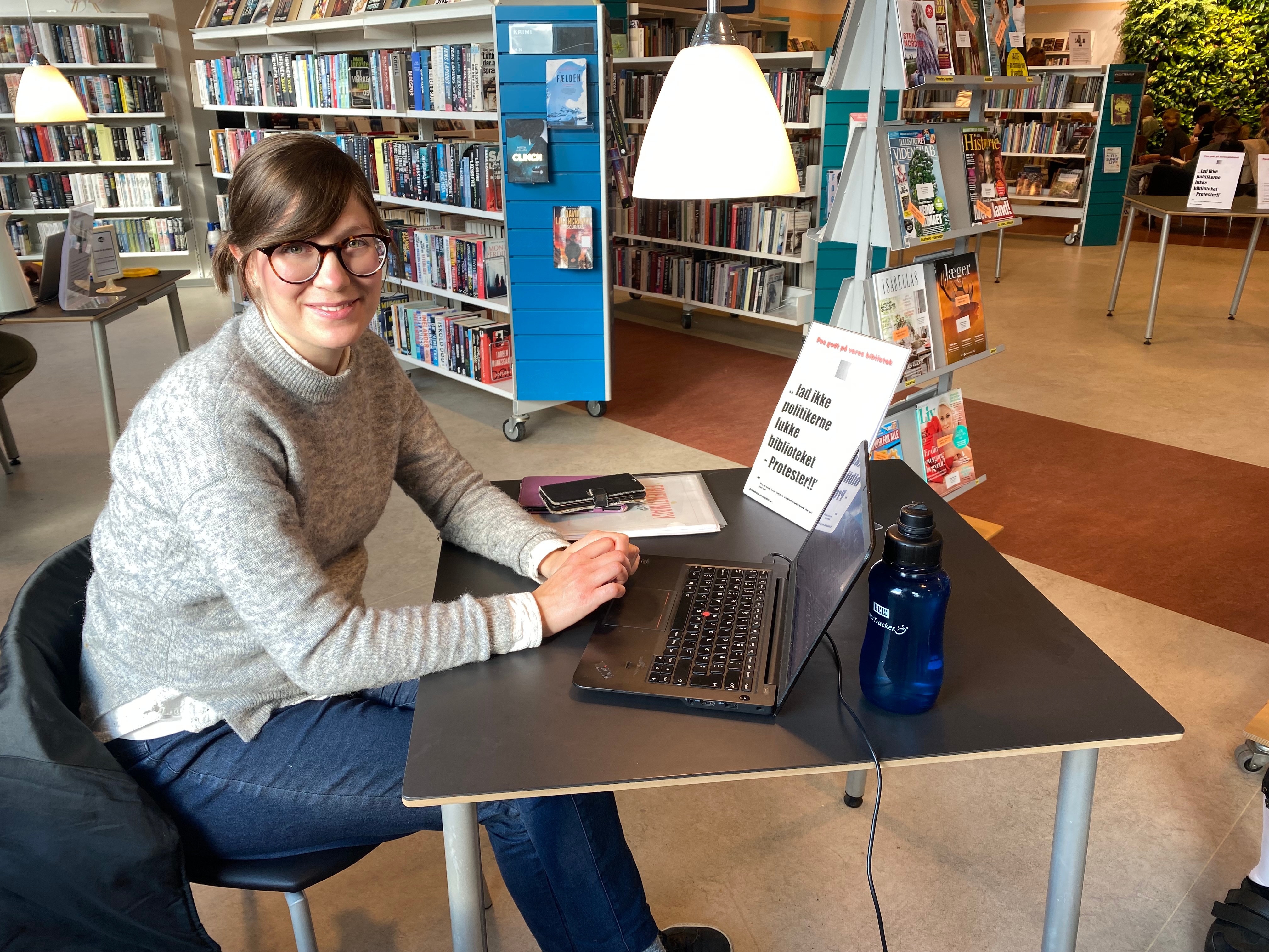 Ved et af bordene sidder Mie Grønne-Grann. Hun er jobsøgende og har ikke noget kontor derhjemme. Hun kommer derfor dagligt forbi Karlslunde Bibliotek for at arbejde.