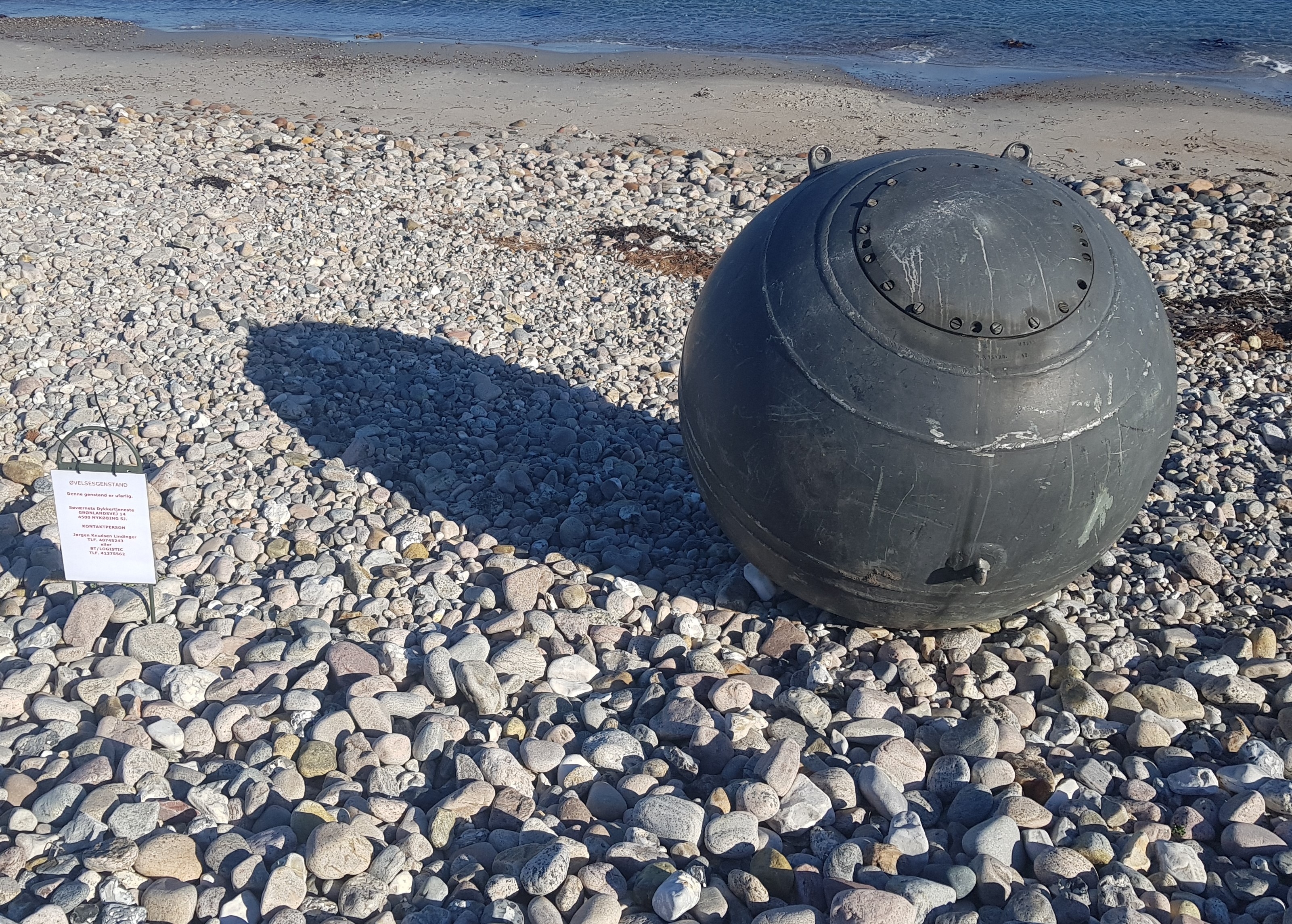 Søværnets Dykkertjeneste, som åbenbart ejer minen, er dog så elskværdig, at de har sat en lille forklaring op ved siden af den sorte, ridsede kugle. Her gør man opmærksom på, at der er tale om en ufarlig øvelsesgenstand.