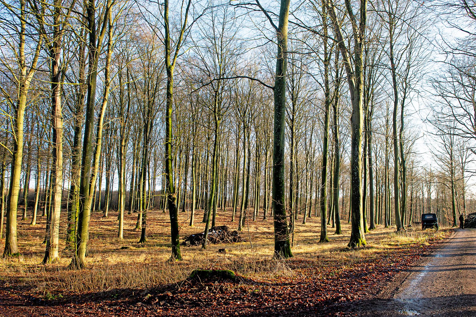 Bøgeskoven med de høje, slanke stammer kunne næsten ikke præsentere sig mere idyllisk denne dag, hvor solen for en gangs skyld skinnede, og man kunne høre fuglekvidder og en hakkende spætte i baggrunden.