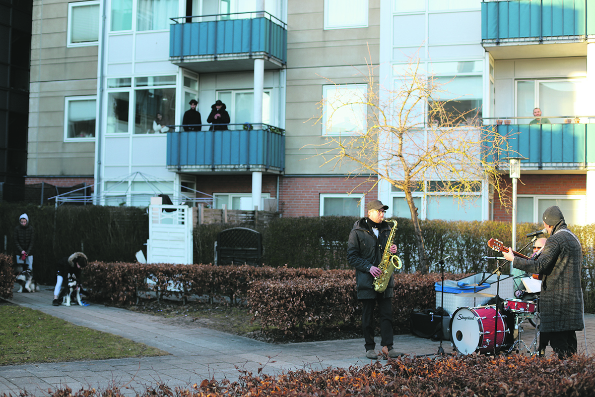 I Tingbjerg blev beboerne overraskede, da Jazzdrengene forleden gav koncert uden for deres vinduer. Foto: Line Falk Tranberg